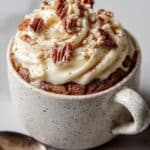 A baked mug cake with a rough brown texture fills a white speckled mug, topped with a generous swirl of creamy white whipped frosting. The frosting is sprinkled with small chunks of glossy brown pecans and a light dusting of cinnamon powder. The mug sits on a white marbled surface next to a vintage-looking tarnished silver spoon. photo taken with an iphone --ar 4:5 --v 7