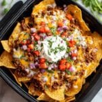 These Air Fryer Nachos are a quick and delicious snack or meal option featuring crispy tortilla chips loaded with seasoned ground beef, refried beans, melted cheddar and Monterey Jack cheeses, and tangy pickled jalapeños. Cooked in the air fryer for perfectly melted cheese and crunchy chips, they’re perfect for game day or a fun family dinner.