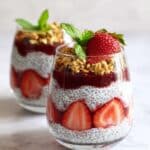 - Layer and Garnish: Repeat the layering process with granola, berry purée, and chia pudding. Finish by topping each parfait with a sprinkle of granola and a whole strawberry as a garnish. Serve immediately for the best texture and flavor.