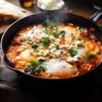 Shakshuka is a vibrant Middle Eastern dish featuring poached eggs in a rich, spiced tomato sauce. It’s perfect for breakfast, brunch, or any meal that calls for something comforting and flavorful.