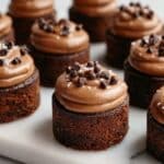 The image shows several small, round chocolate cakes placed closely together on a white marble surface. Each cake has two layers: a dense, dark brown base and a thick, smooth milk chocolate frosting on top. The frosting is neatly swirled and decorated with small chocolate chips and crunchy nuts. The cakes have a rich, moist texture, and the overall look is glossy and inviting. photo taken with an iphone --ar 4:5 --v 7