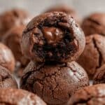 The image shows a close-up of several round chocolate cookie balls stacked together on a white marbled surface. Each cookie ball has a rough, cracked outer texture with a rich dark brown color, and visible glossy melty chocolate chunks embedded in the surface. The focus is on the front cookie ball which shows the shiny chocolate center clearly, while other cookie balls blur softly in the background, giving a warm, fresh-baked feeling. photo taken with an iphone --ar 4:5 --v 7