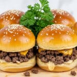 Keywords: Cheeseburger sliders, Hawaiian rolls, slider recipe, party appetizer, baked sliders, ground beef sliders, cheesy sliders