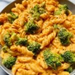 The image shows a close-up of a creamy pasta dish with spiral-shaped pasta coated in a thick orange sauce. Small green broccoli florets are mixed evenly throughout the pasta, adding a pop of color. The sauce looks smooth and rich, covering each piece, and there are small bits of what seems to be chicken scattered on top. Black pepper specks are sprinkled lightly over the dish, giving it texture. The pasta fills the frame, making it look warm and inviting. The background is a white marbled texture. photo taken with an iphone --ar 4:5 --v 7