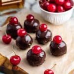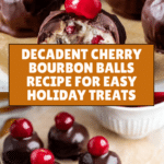 Keywords: cherry bourbon balls, bourbon balls recipe, holiday treats, chocolate covered cherry balls, bourbon pecan dessert