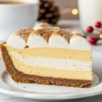 A slice of pie with three layers: a thick, crumbly brown crust at the bottom, a smooth, pale yellow creamy filling in the middle, and a swirl of white whipped cream on top, sprinkled with light brown cinnamon powder. The pie rests on a white plate with a slightly wavy edge, placed on a white marbled surface. In the background, a white cup filled with coffee and a clear glass of milk with pinecones and red berries can be seen softly blurred with warm lights. Photo taken with an iphone --ar 4:5 --v 7