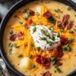 Keywords: loaded baked potato soup, creamy potato soup, comfort food, hearty soup, cheddar cheese soup, bacon soup