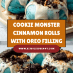 These Cookie Monster Cinnamon Rolls combine classic cinnamon roll flavors with a fun twist – blue coloring and crushed chocolate sandwich cookies throughout. Soft, fluffy dough is filled with cinnamon sugar, crushed Oreos, and mini chocolate chips, then topped with a smooth cream cheese icing for an irresistible treat perfect for breakfast or dessert.