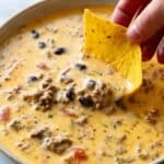 Keywords: Cowboy Queso, queso dip, party dip, game day appetizer, cheesy dip, Tex-Mex dip, spicy queso
