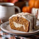Keywords: pumpkin bread, cream cheese filling, chai sugar, spiced bread, fall recipes, moist pumpkin bread, holiday baking