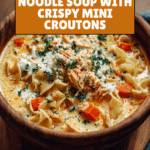 Keywords: Creamy chicken noodle soup, homemade croutons, chicken soup recipe, quick chicken noodle soup, comfort food soup