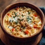 This creamy chicken noodle soup is a comforting bowl of tender chicken, delicate pasta, and fresh vegetables in a rich, velvety broth. Topped with crispy bacon and crunchy mini croutons, it’s perfect for a cozy lunch or dinner.