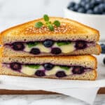 This Crispy Blueberry Grilled Cheese recipe combines the tangy sweetness of homemade blueberry lemon thyme jam with the rich, melty goodness of mozzarella and white cheddar cheeses, all sandwiched between crispy, buttery sourdough bread. Perfect for a gourmet twist on a classic comfort food, this grilled cheese offers a balanced blend of fruity and savory flavors finished with a sprinkle of flaky sea salt and fresh thyme for an aromatic touch.