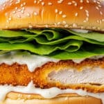 This Crispy Chicken Caesar Sandwich recipe features tender, pounded chicken breasts coated in a crunchy panko breadcrumb crust, fried to golden perfection, and layered with fresh romaine lettuce, creamy Caesar dressing, and Parmesan cheese on toasted brioche buns. A delightful twist on classic Caesar salad flavors, served hot and perfect for a satisfying meal.