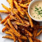 Store any leftover sweet potato fries in an airtight container in the refrigerator for up to 3 days. To reheat and restore some crispiness, spread the fries on a baking sheet and bake in a preheated 400°F (200°C) oven for about 5-10 minutes. Avoid microwaving as it can make them soggy.