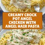 Crock Pot Angel Chicken is a comforting and creamy slow-cooked chicken dish made with seared boneless skinless chicken breasts simmered in a luscious sauce of cream cheese, butter, cream of chicken soup, garlic, chicken broth, and Italian seasoning. Served over tender angel hair pasta, it’s an easy and flavorful meal perfect for busy days or cozy dinners.