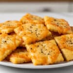 A white plate is filled with a pile of golden, crispy baked cheese crackers. The crackers are unevenly shaped squares and rectangles with a crunchy texture, showing bubbly melted cheese with browned spots on top. Small black specks of cracked pepper are sprinkled on several crackers. The plate rests on a white marbled surface with a blurry kitchen background. photo taken with an iphone --ar 4:5 --v 7