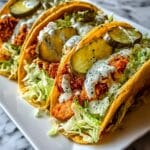 Dill Pickle Ranch Smash Chicken Tacos are a flavorful twist on classic tacos, combining juicy seasoned ground chicken with tangy pickles and creamy ranch-flavored cottage cheese. These tacos offer a delicious balance of textures and a quick, easy option for weeknight dinners.