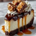 Keywords: Snickers cheesecake, easy cheesecake recipe, dessert, chocolate caramel cheesecake, Snickers dessert, creamy cheesecake