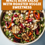 Keywords: farro salad, white bean salad, roasted vegetables, healthy salad, vegetarian salad, cannellini beans, lemon dressing, goat cheese salad