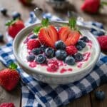 A white bowl filled with a creamy white yogurt base, topped with fresh blueberries, raspberries, and two large halved strawberries placed in the center. The berries are shiny and vibrant, with the blueberries dark blue, raspberries deep red, and strawberries bright red with green leaves. There is a light drizzle of pink berry sauce over the yogurt. The bowl is set on a blue and white checkered cloth over a wooden table, with loose blueberries and strawberries scattered around. The image is bright with natural light and soft focus on the background. Photo taken with an iphone --ar 4:5 --v 7