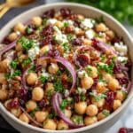 A vibrant and refreshing Feta and Cranberry Chickpea Salad featuring creamy feta, sweet dried cranberries, and a zesty lemon vinaigrette. Perfect as a light meal or a flavorful side, this salad combines protein-packed chickpeas with crunchy nuts and fresh herbs for a satisfying bite.