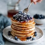 A tall stack of fluffy brown pancakes sits on a white plate, with smooth layers lightly covered in syrup dripping down the sides. On top of the stack, there is a thick layer of fresh blueberries mixed with small white star-shaped sprinkles. Some blueberries and syrup spill slightly over the edge onto the white marbled surface beneath the plate. A woman's hand with a fork is gently touching the pancakes from the side. In the background, there is a glass jar of syrup and more blueberries. Photo taken with an iphone --ar 4:5 --v 7