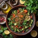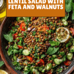 This French Lentil Salad is a vibrant, nutritious dish featuring tender green lentils cooked in broth and combined with sautéed vegetables, toasted walnuts, and crumbled feta cheese. Tossed in a tangy Dijon and red wine vinegar dressing, this salad balances heartiness with fresh flavors, making it perfect for a light lunch or a side dish.