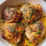 A white bowl holds four pieces of cooked chicken thighs with crispy, golden brown skin, speckled with black pepper and red pepper flakes. The chicken is covered with a shiny, thick sauce that looks like butter or oil, pooling gently around the pieces. Fresh green herbs, likely chopped parsley, are sprinkled generously on the chicken and in the sauce, adding a touch of bright green. The chicken pieces have a slightly rough texture with visible seasoning, and the sauce reflects light, making the dish look rich and moist. The whole bowl sits on a white marbled surface. photo taken with an iphone --ar 4:5 --v 7