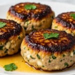 The image shows four round, golden-brown patties with a crispy, slightly charred top layer that looks juicy and shiny from a drizzle of sauce. Each patty is thick with a textured, mixed layer of light and speckled bits of herbs and possibly cheese inside. The patties are placed closely together on a glossy white plate with a light amber sauce pooling around them, and each patty is topped with small green leafy parsley for garnish. The plate is sitting on a white marbled surface. Photo taken with an iphone --ar 4:5 --v 7