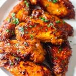 The image shows a close-up of six chicken wings arranged closely on a white plate, sitting on a white marbled surface. Each wing has a shiny, deep orange glaze with darker brown, crispy edges from grilling, sprinkled with small bits of green herbs for contrast. The texture looks slightly sticky and saucy with specks of black seasoning visible on the crispy skin. The wings fill most of the plate, and the lighting highlights their glossy, rich color and the fresh green garnish scattered on top. photo taken with an iphone --ar 4:5 --v 7