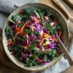 A fresh and vibrant Kale and Apple Slaw tossed with a honey sesame vinaigrette, complemented by crunchy pepitas. This salad combines thinly sliced kale massaged to tender perfection with crisp apple, julienned carrots, and purple cabbage, all brought together with a flavorful dressing featuring ginger, garlic, and toasted sesame oil. Perfect as a healthy side dish or light meal.