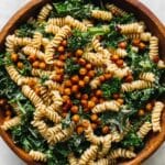 Keywords: kale pasta salad, vegan pasta salad, chickpea salad, tahini dressing, kale caesar salad, healthy pasta salad