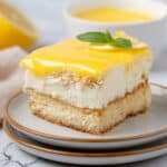 A close-up of a square dessert on a white plate with a light brown rim, placed on a stack of two similar plates over a white marbled surface. The dessert has three visible layers: the bottom layer is a light beige cake that looks soft and crumbly, the middle layer is thick, white, creamy filling, and the top layer is a smooth, glossy yellow topping that covers the entire surface. A small green basil leaf and a small piece of lemon peel rest on the top right corner of the dessert. Next to the dessert is a small white bowl filled with the same yellow sauce as the top layer. Photo taken with an iphone --ar 4:5 --v 7