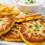The image shows a close-up of a white plate with several golden-brown potato pancakes stacked unevenly. Each pancake has a crispy, slightly rough edge and a soft, warm center with a light yellow color. Melted cheese covers the top layer with some browned spots, and a small sprinkle of chopped green herbs adds a fresh touch. To the side, a small pile of light yellow French fries with a slightly uneven crisp texture fills the corner of the plate. A white bowl with a creamy white sauce speckled with small green herbs is visible in the background on the white marbled surface. The photo is taken with an iphone --ar 4:5 --v 7