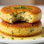 Two golden brown, crispy potato cakes are stacked on a white plate over a white marbled surface. The top potato cake has a bite taken out of it, revealing a soft, creamy pale yellow inside with small specks of green herbs. The edges of the cakes are textured with a crunchy crust, and both are sprinkled with finely chopped green herbs on top. A light pool of buttery sauce surrounds the base of the bottom cake, reflecting soft light. The background is softly blurred, giving a warm and cozy feel. photo taken with an iphone --ar 4:5 --v 7