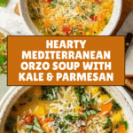 A hearty and flavorful Mediterranean Orzo Soup featuring tender orzo pasta, vibrant cherry tomatoes, fresh kale, and fragrant herbs simmered in a savory vegetable stock with a Parmesan rind for depth. This comforting soup is perfect for a nourishing lunch or light dinner, finished with a drizzle of extra virgin olive oil, freshly grated Parmesan, and chopped basil for a burst of freshness.