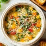 A hearty and flavorful Mediterranean Orzo Soup featuring tender orzo pasta, vibrant cherry tomatoes, fresh kale, and fragrant herbs simmered in a savory vegetable stock with a Parmesan rind for depth. This comforting soup is perfect for a nourishing lunch or light dinner, finished with a drizzle of extra virgin olive oil, freshly grated Parmesan, and chopped basil for a burst of freshness.