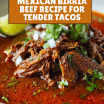 Keywords: Birria, Mexican beef stew, braised beef, red chile broth, beef chuck, short ribs, traditional Mexican recipe, birria tacos, slow braised beef