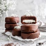 - Coat the Cakes: Dip the bottom of each filled cake into the melted or tempered chocolate, then place them on a parchment-lined sheet pan to set. After the chocolate on the bottom has set, place the cakes on a wire cooling rack and spoon melted chocolate over the tops and sides to fully coat them. Allow the chocolate coating to fully harden at room temperature or in a cool environment before serving.