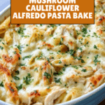 This Mushroom Cauliflower Alfredo Pasta Bake is a creamy, comforting dish combining a healthy cauliflower-based Alfredo sauce with sautéed mushrooms, onions, and tender penne pasta. Topped with mozzarella and parmesan cheese, then baked until bubbly and golden, it’s a perfect hearty meal that offers rich flavors with a nutritious twist.