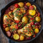 This One Pan Spanish Chicken with Chorizo, Tomato, and Potatoes is a hearty and flavorful meal perfect for any night of the week. With tender chicken thighs, spicy chorizo, and rich tomato sauce simmered together, it’s a comforting dish that’s easy to prepare and sure to impress.