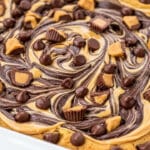 - Top with chocolate and candy: Sprinkle the milk chocolate chips along with the remaining chopped peanut butter cups over the top for added chocolatey goodness.