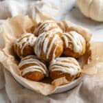 The image shows a white bowl lined with crinkled light brown parchment paper holding six round, golden-brown pumpkin doughnut holes arranged closely together. Each doughnut hole is topped with uneven, creamy white icing drizzled in thin, irregular lines and some thicker patches. The bowl is set on a soft, beige cloth on a white marbled surface, with a blurred white pumpkin and small dish of cinnamon in the background. photo taken with an iphone --ar 4:5 --v 7