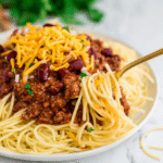 Traditionally, it’s served over spaghetti noodles topped with shredded cheddar cheese, diced onions, and kidney beans. Feel free to customize with your favorite toppings like hot sauce or oyster crackers.