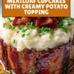 Keywords: meatloaf cupcakes, bacon wrapped meatloaf, bourbon BBQ glaze, mashed potato frosting, smoky meatloaf, individual meatloaf servings, baked meatloaf, comfort food