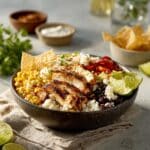 - Assemble the Bowls: Divide the warm rice evenly among four bowls. Top each bowl with sliced chicken and a generous scoop of the street corn mixture. Garnish with sliced avocado, fresh cilantro, extra Cotija cheese, and a drizzle of the creamy sauce. Serve with lime wedges and tortilla chips on the side if desired.