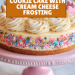Keywords: sugar cookie cake, vanilla cake with cookie dough, cream cheese frosting, holiday dessert, festive cake, layered cake