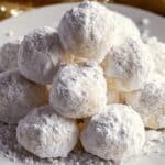 A white plate with a pile of round snowball cookies that have a soft texture and are covered in a thick layer of powdered sugar, giving them a snowy appearance with some sugar scattered around the plate edges, all on a white marbled textured surface with a soft golden cloth blurred in the background. photo taken with an iphone --ar 4:5 --v 7