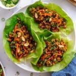 Delicious and healthy Thai Chicken Lettuce Wraps made with ground chicken, fresh vegetables, and a flavorful Thai-inspired sauce. These wraps are perfect as a light meal or appetizer, combining a savory ginger-garlic pan sauce with crunchy cashews and fresh herbs all wrapped in crisp butter lettuce leaves.